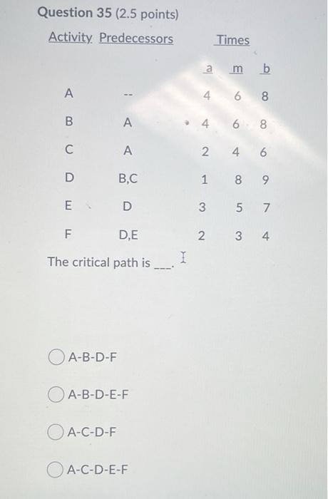 Solved Question 35 2 5 Points Activity Predecessors Times Chegg Com